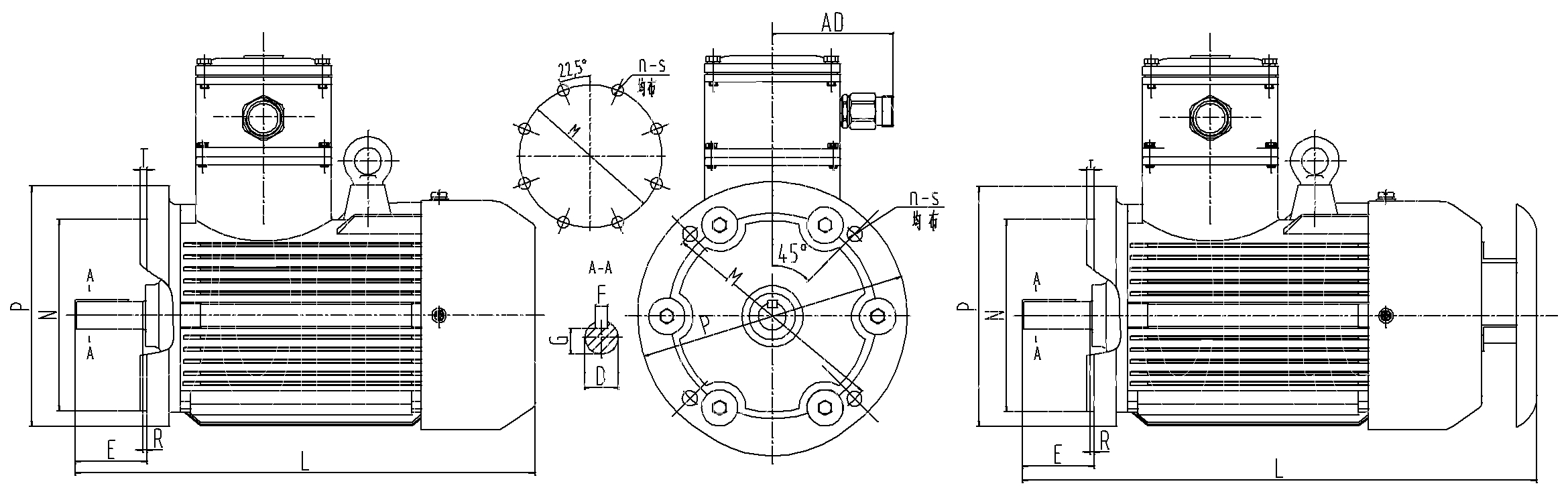 B5卧式安装或V1立式安装、机座不带底脚、端盖有凸缘(带通孔)